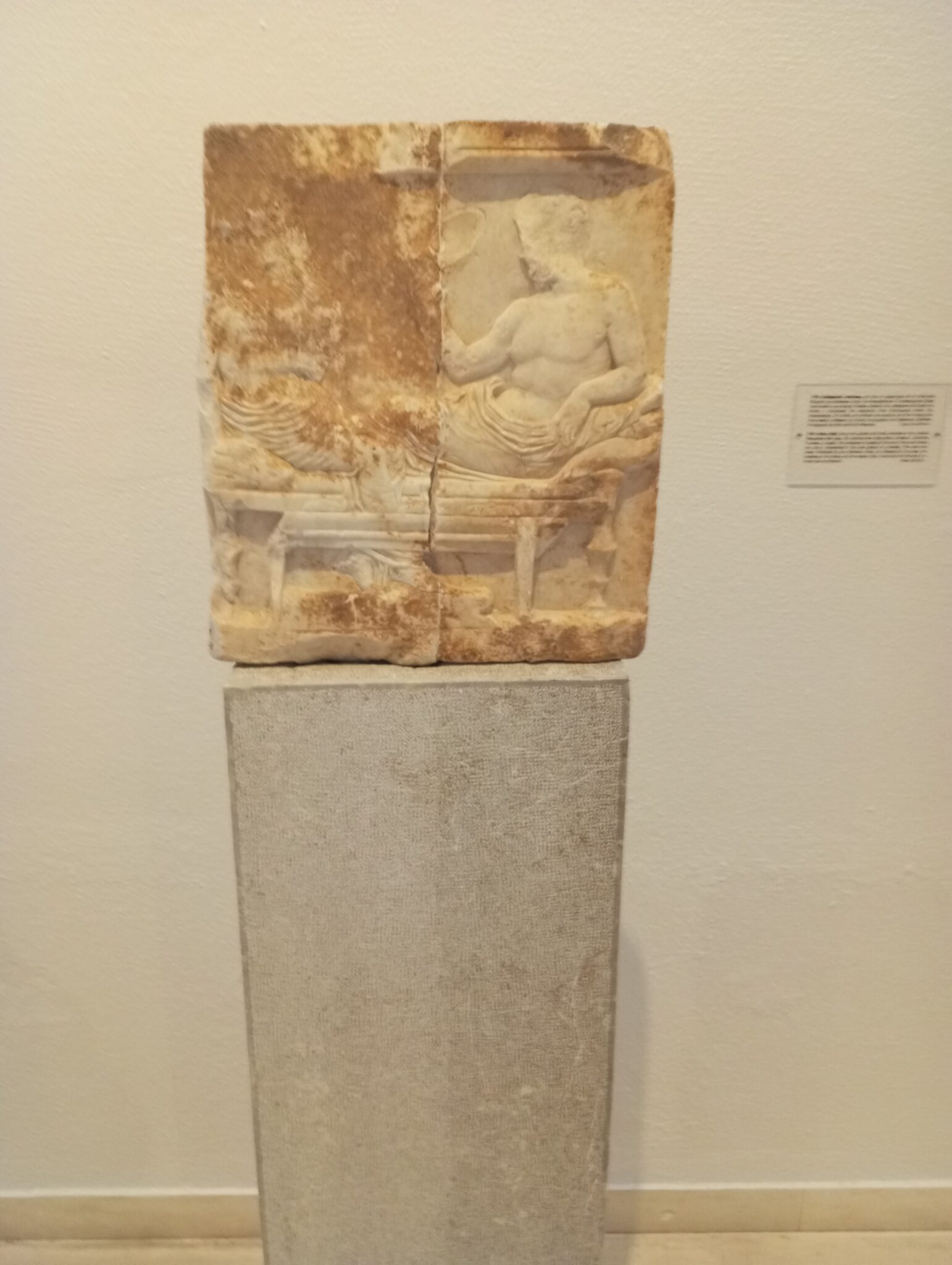 Το συγκεκριμένο ανάγλυφο είναι ένα από τα αρχαιότερα και διατηρητέα δείγματα του κλασικού τύπου των Νεκροδείπνων. Ειδικότερα, απεικονίζεται ένας ανακεκλιμένος ήρωας να κρατά φιάλη. Άλλοι υποστηρίζουν ότι έχει στο χέρι του ένα στεφάνι. Στην απέναντι πλευρά εικονίζεται η σύζυγός του στην τελετουργική στάση της αποκαλύψεως. Το εν λόγω αναθηματικό ανάγλυφο χρονολογείται γύρω στο 420 π.Χ.