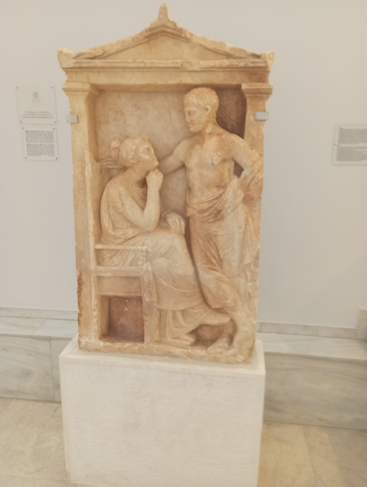 Χρονολογείται στον 4ο αιώνα π.Χ. και προέρχεται από ένα από τα νεκροταφεία του αρχαίου Πειραιά. Η παράσταση ακολουθεί τον τύπο των επιτύμβιων στηλών της Αττικής με οικογενειακές σκηνές. Η τρυφερότητα με την οποία απεικονίζονται οι μορφές εκφράζει τη στενή σχέση και τη συναισθηματική σύνδεσή τους. Παράλληλα, η σύγκλιση των κεφαλών τους προβάλλει την αγάπη αλλά και τη μελαγχολία που διακατέχουν τα δύο πρόσωπα. Η χρονολόγηση προκύπτει από την απόδοση της πτυχολογίας των μορφών αλλά και από το έξεργο ανάγλυφο.