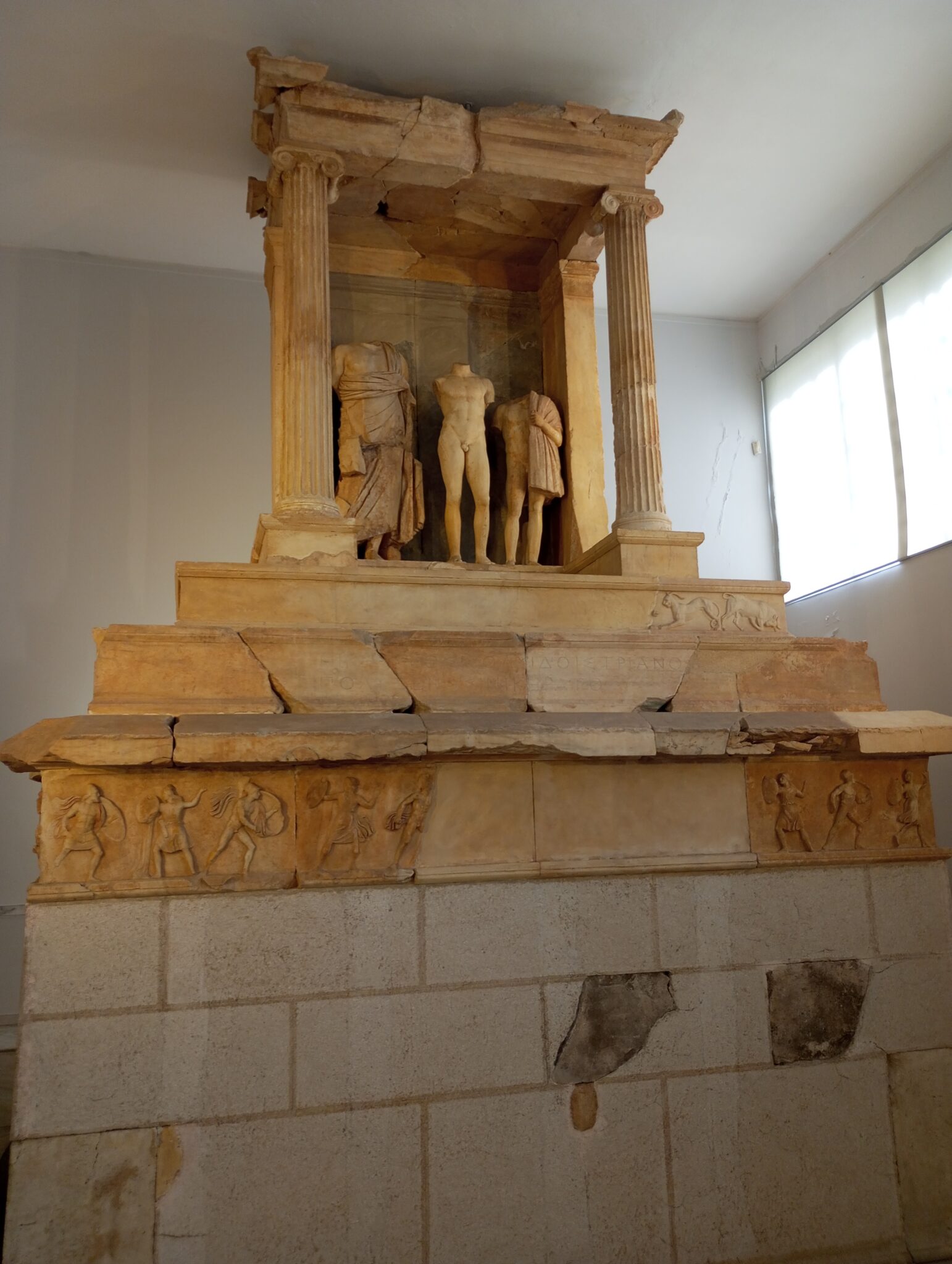 Στην τρίτη, κατά σειρά, βαθμίδα η ζωφόρος απεικονίζει τη μυθική μάχη ανάμεσα στους Έλληνες και τις Αμαζόνες. Οι μορφές είναι λαξευμένες σε χαμηλό ανάγλυφο και παρουσιάζουν έντονη κινητικότητα. Συγκεκριμένα, διακρίνονται έφιππες Αμαζόνες να συγκρούονται με πεζούς Έλληνες πολεμιστές. Οι Αμαζόνες φέρουν τον χαρακτηριστικό τους κοντό χιτώνα, ενώ οι κινήσεις των σωμάτων και των αλόγων αντανακλούν την ένταση και το πάθος της μάχης.