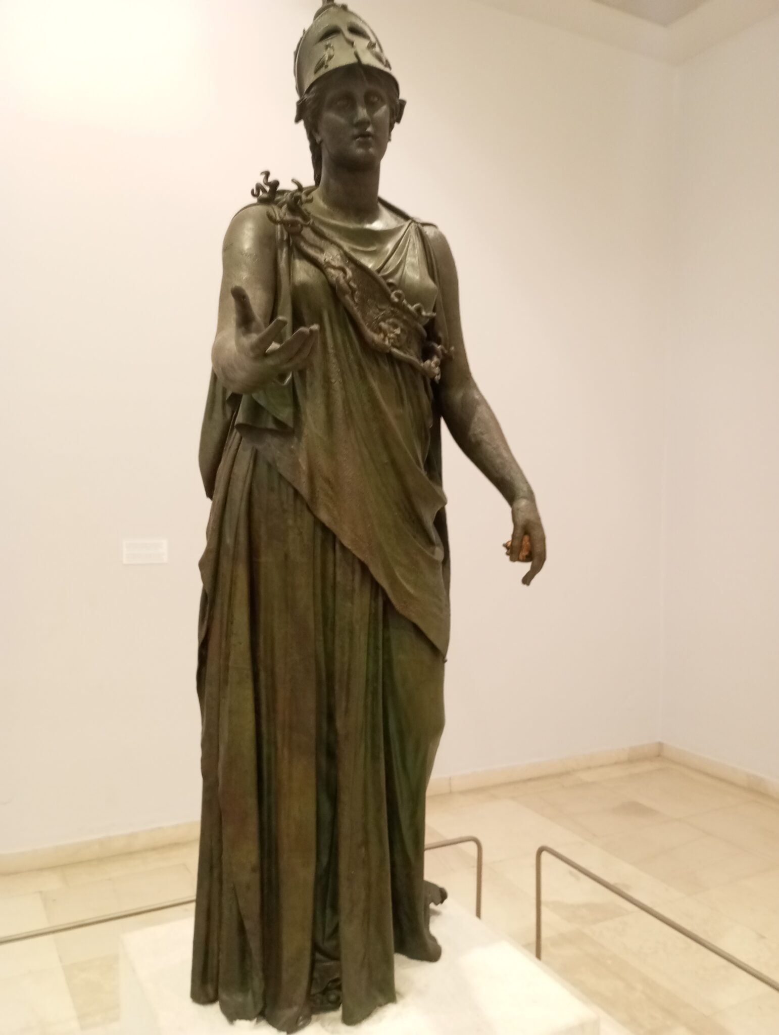 Το έργο χρονολογείται στο τέλος του 4ου αιώνα π.Χ. Απεικονίζεται η θεά Αθηνά, είναι η περίφημη Χάλκινη Αθηνά του Πειραιώς. Πρόκειται για ένα από τα σπανιότερα χάλκινα αγάλματα που μας έχουν διασωθεί από την αρχαιότητα. Η θεά παριστάνεται σε ήρεμη αλλά επιβλητική στάση. Φοράει δωρικό πέπλο και φέρει λοξή αιγίδα. Η αιγίδα αποτελούσε το προστατευτικό δέρμα της με την κεφαλή της Μέδουσας στο κέντρο. Λειτουργεί περισσότερο ως διακοσμητικό στοιχείο παρά ως βαρύς θώρακας. Όσον αφορά την ενδυμασία ο πέπλος σχηματίζει βαθιές, κατακόρυφες πτυχώσεις, δίνοντας στο άγαλμα μια σταθερότητα και έναν μνημειακό χαρακτήρα. Αν εξετάσει κΠισανείς το άγαλμα από την πίσω μεριά, θα παρατηρήσει ότι το πέπλο είναι ανασηκωμένο ώστε να καλύπτει τους ώμους.