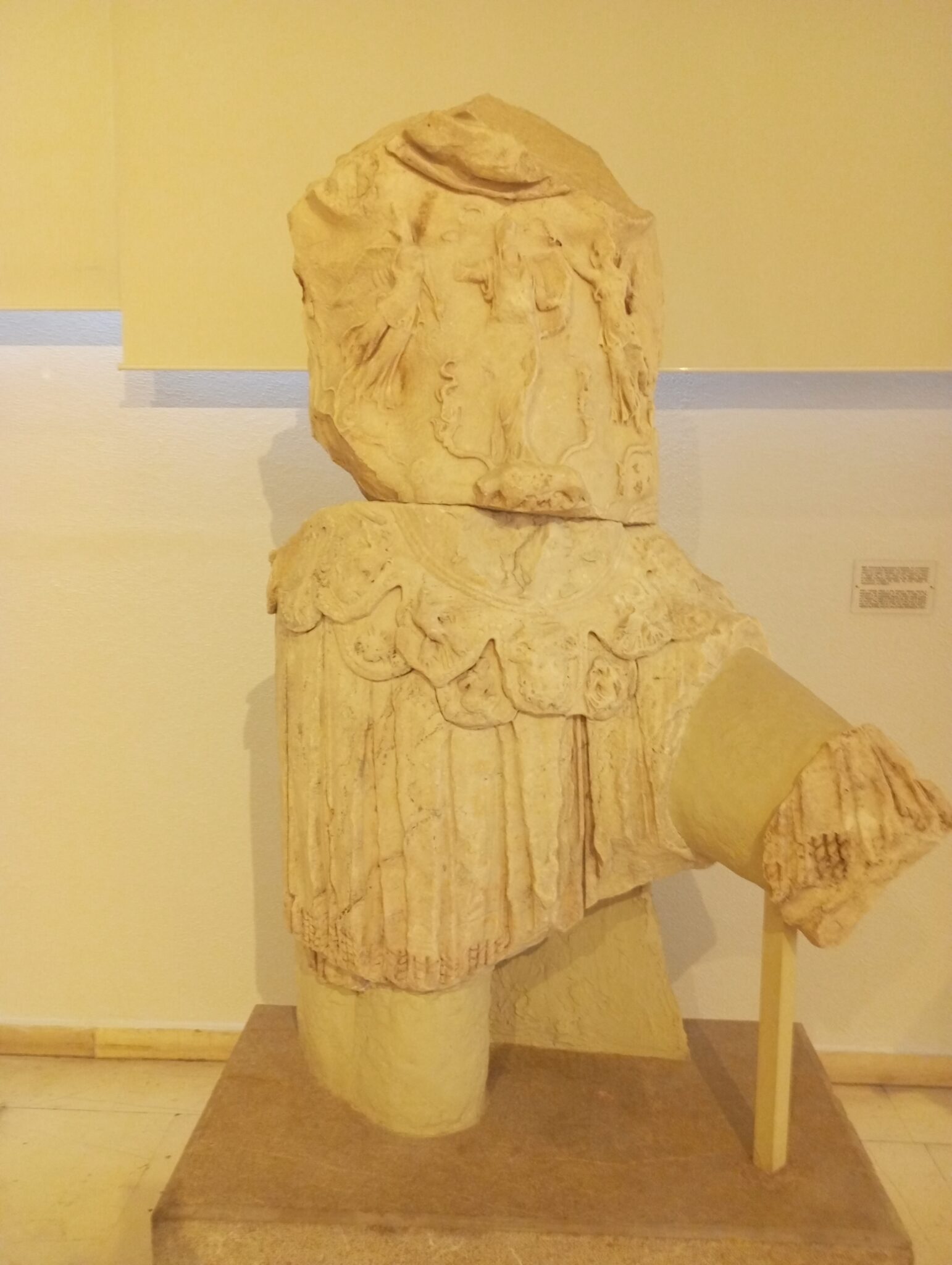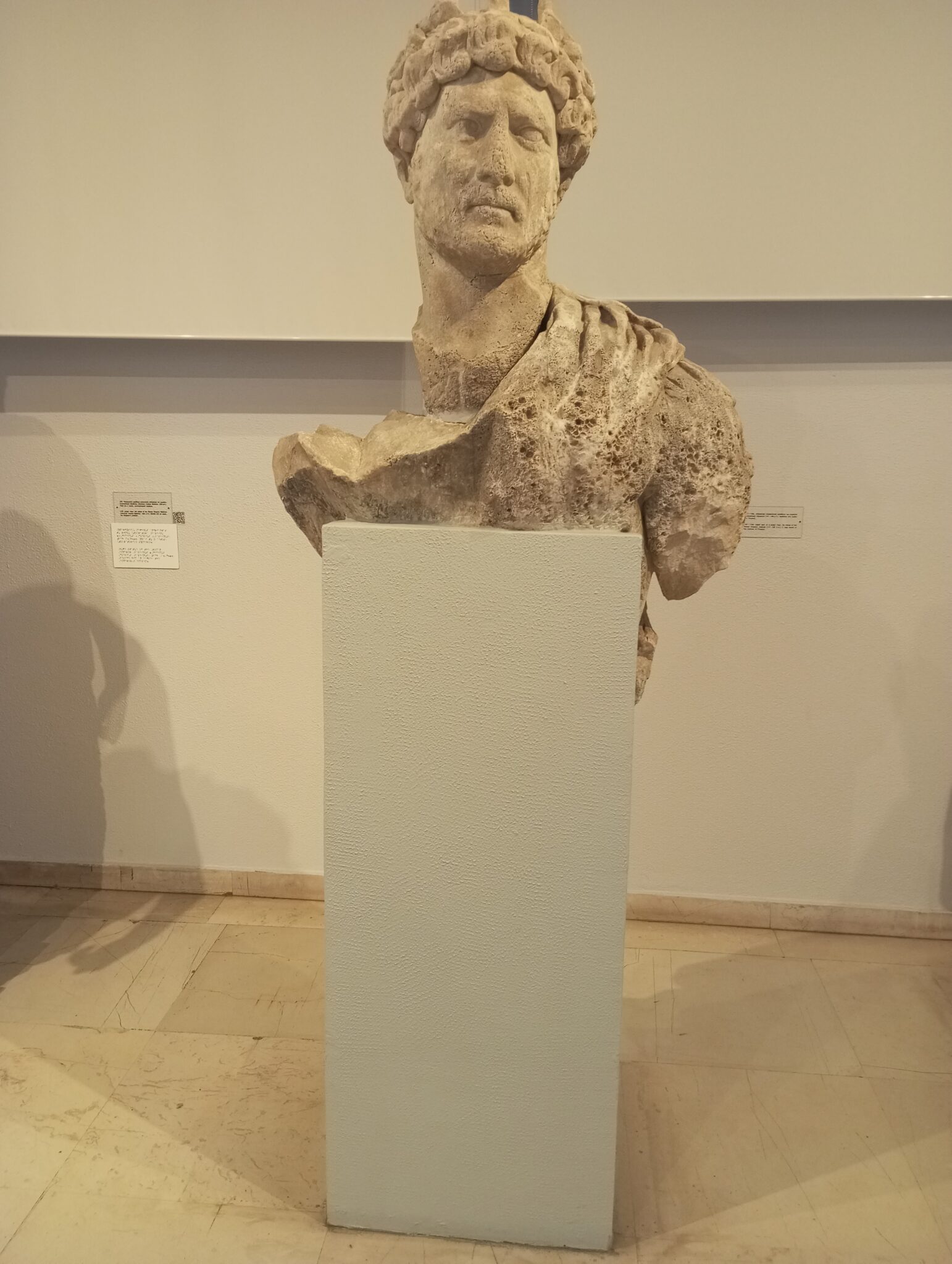 Το ανωτέρω απεικονίζει έναν ανδριάντα υπερφυσικού μεγέθους από πεντελικό μάρμαρο. Αποδίδεται στον Ρωμαίο αυτοκράτορα Αδριανό (117-138 μ.Χ.). Σώζονται μόνο η κεφαλή και ο θώρακας. Έχει ύψος 1,48 μέτρα, ενώ υπολογίζεται ότι το συνολικό ύψος του αγάλματος έφτανε έως τα 3,30 μέτρα.